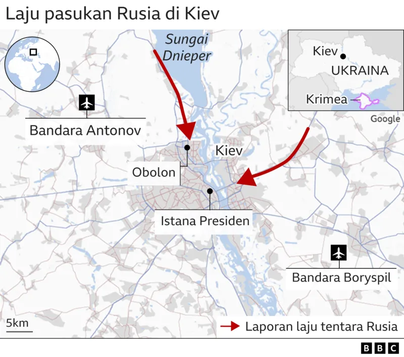 Kantor berita Interfax kemarin (25/02) melaporkan bahwa Kementerian Pertahanan Rusia mengatakan pasukan mereka telah mengambil alih landasan udara penting, Hostomel di dekat Kiev.