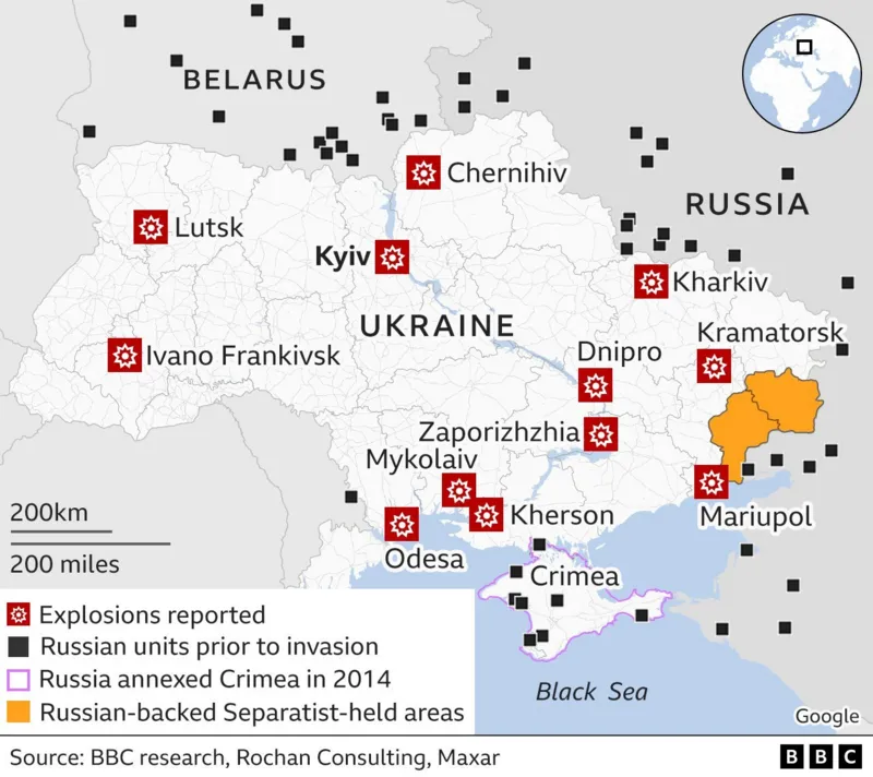 Ukraina mengatakan setidaknya 33 lokasi warga sipil menjadi sasaran.