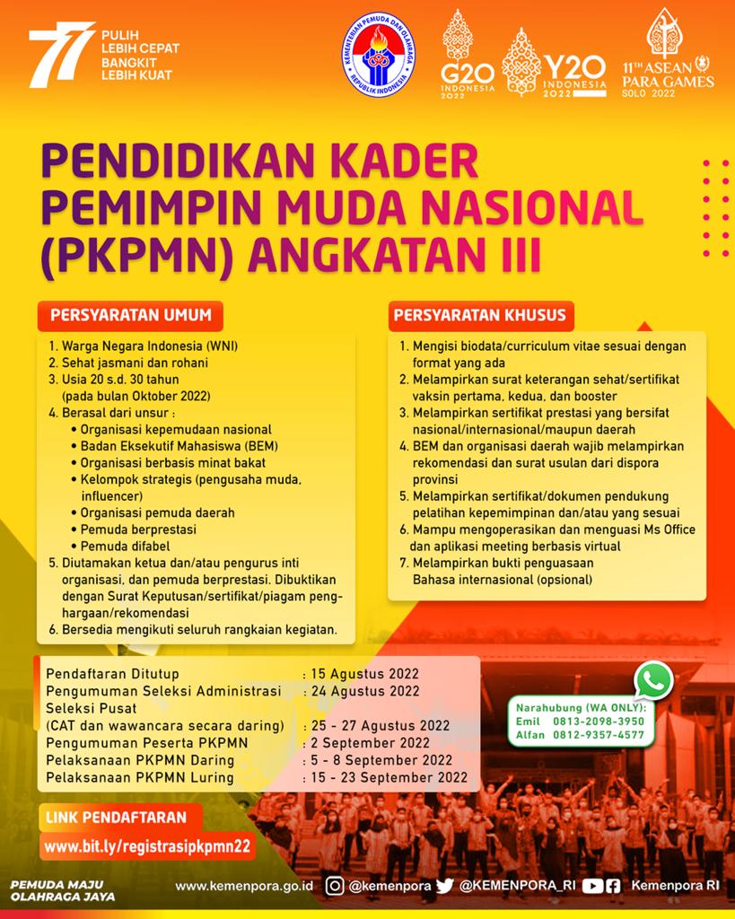 Kementerian Pemuda dan Olahraga RI (Kemenpora) mencari kader muda pemimpin bangsa untuk mengikuti Pendidikan Kader Pemimpin Muda Nasional (PKPMN) Angkatan III Tahun 2022.